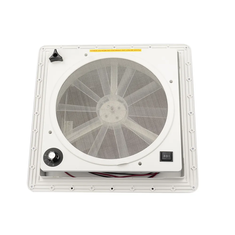 - EASY-TO-INSTALL: Fits all rough 14” x 14” inch roof openings. Built in fuse for circuit protection and 2 extra 5A slow fuse in the package. An extra screen included. Screws and white interior garnish included. This rv roof fan vent can be installed as ceiling fan or bathroom fan for your Recreational Vehicle.