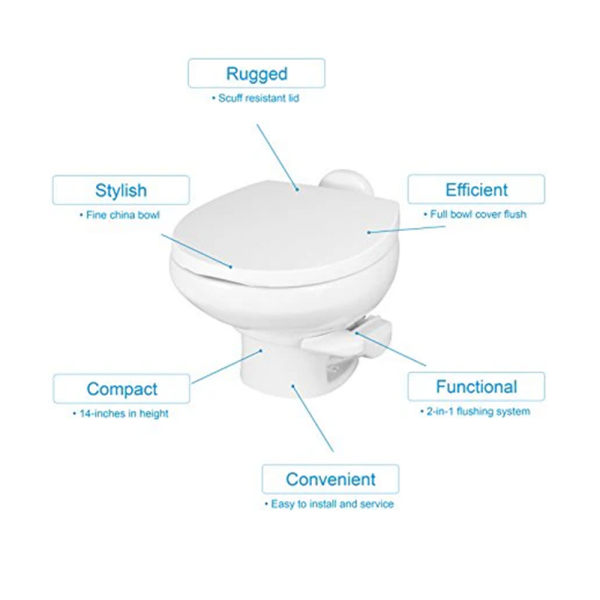 The RV toilets with the comfort, performance and luxury RVers want. This contemporary china bowl/polymer base toilets offer a powerful flush with 100% bowl coverage and a revolutionary new flush valve that wipes clean with every flush. It’s comfortable and it has a full-size residential seat. The High profile models have a 17-1/2″ seat height. Low profile models feature 12-1/2″ seat height. All models 16″ W x 20-1/2″ D. Single-pedal flush convenience. Optional Water Saver hand spray is available. It’s an easy installation and the product comes with a 1 year warranty.