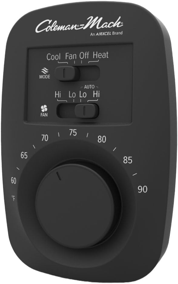Wall Thermostat; Single Stage; For Heat/ Cool Control; Mechanical Readout; 12 Volt DC; With High/ Low Fan Speed Control; With Auto/ On Mode Fan Control; Black Case
