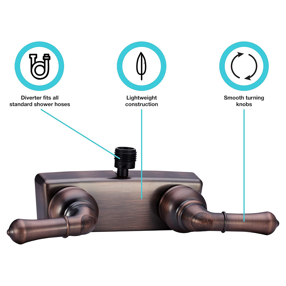 - Features | This faucet boasts an elegant and classic exterior, fully functional diverter, and two teapot lever handles to quickly adjust temperature and water pressure. And there will be no lack of pressure through the diverter with the generous stream, as this faucet will produce a straight and even pressure every time! This model is made for, and perfect, for accommodating everyday use in your recreational vehicle, so you can focus on the open road, and not your faucet.