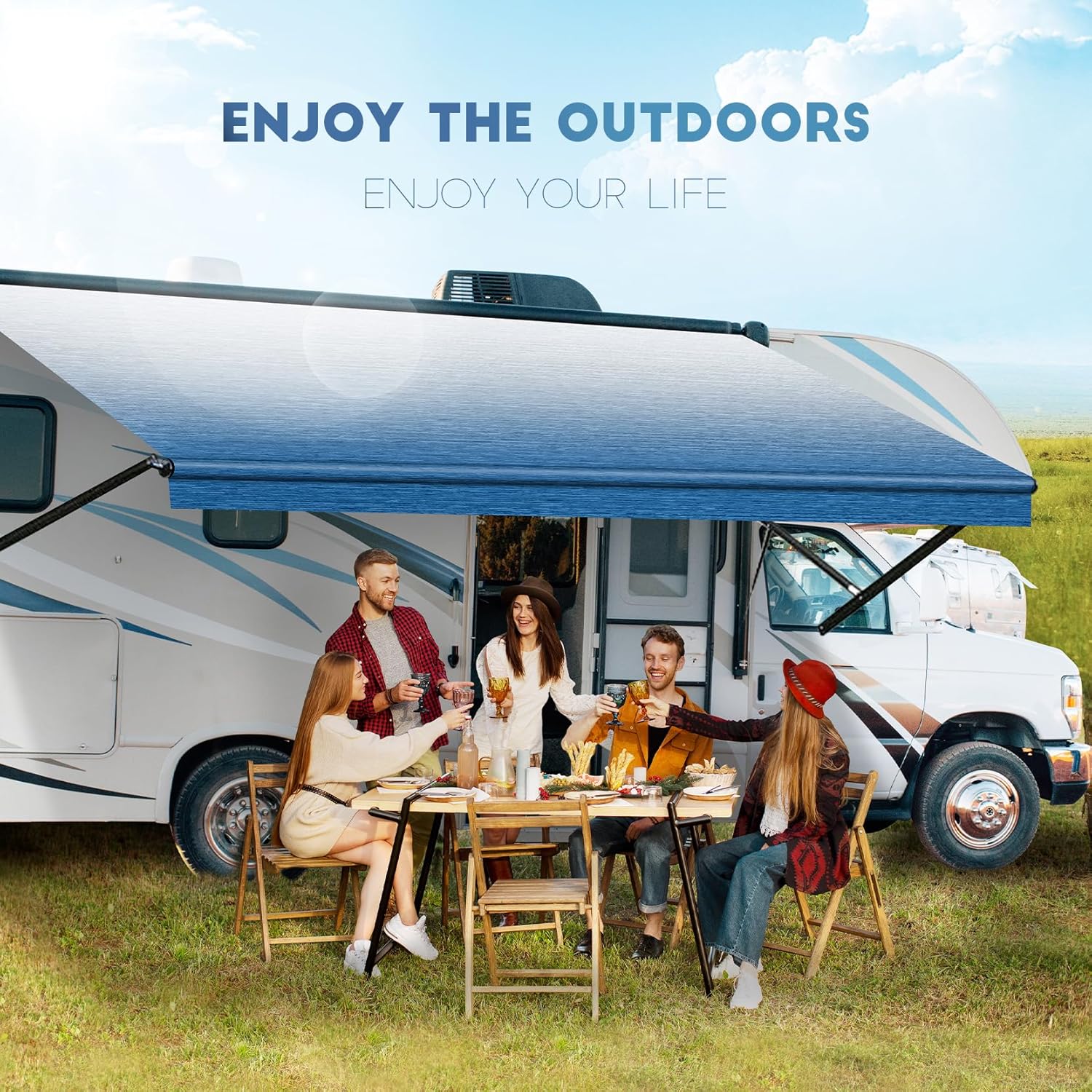 The RV awning fabric replacement comes in multi-size from 10ft to 21ft with fixed fabric projection of 8′, which is compatible for most manual and electric RV awning brands in the market from Dometic, Carefree of Colorado, Solera, etc. Please measure the distance between the center of the right and left awning arms to select the suitable size fabric replacement for your camper awning. Eg: If your awning size is 16′, choose the size 16FT.